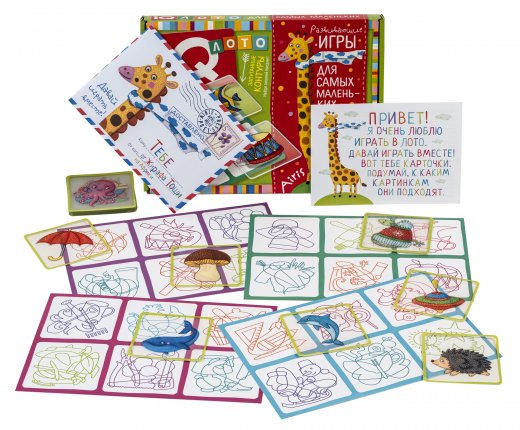 В коробке: 4 картонные карты, 27 прозрачных карточек (24 основные карточки и 3 дополнительные для усложнения игры), конверт с письмом от жирафика Тоши и инструкцией для взрослых.