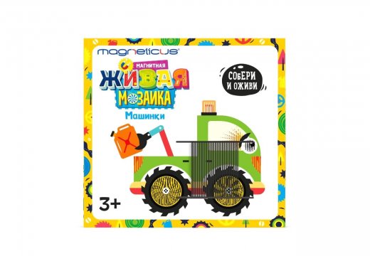Сначала крохам предстоит соединить элементы мозаики в единую картинку на специальном игровом поле с металлической поверхностью. В комплекте есть красочная листовка с примерами картинок для сборки, а также «волшебная» пленка, благодаря которой машинки и техника «поедут». Элементы из набора выполнены из магнитного материала и окрашены яркими, стойкими красителями.