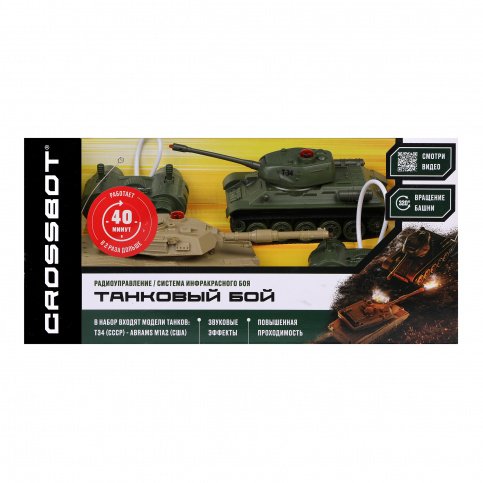 Радиоуправляемые модели танков Abrams M1A2 (США) и Т-34 (СССР) с реалистичными звуковыми и световыми эффектами при стрельбе и визуальными эффектами (отдача при выстреле) выполнены в масштабе 1:32. Танки осуществляют движение вперёд и назад, поворачивают вправо и влево, преодолевают подъёмы под углом 45°, совершают круговое вращение на месте и поворот башни вправо-влево на 320°. Ведение боя: при стрельбе из пушки танка инфракрасный луч воздействует на датчик поражения танка противника. За один бой возможно только 3 попадания по танку противника, после этого атакованный танк необходимо включить заново. При первом попадании отключается левая гусеница танка. При втором попадании отключается правая гусеница танка. При третьем попадании раздается звук взрыва, и атакованный танк перестаёт работать. Третье попадание расценивается как полное поражение танка противника. Для продолжения игры включите атакованный танк. Через 10 секунд работа танка будет восстановлена.