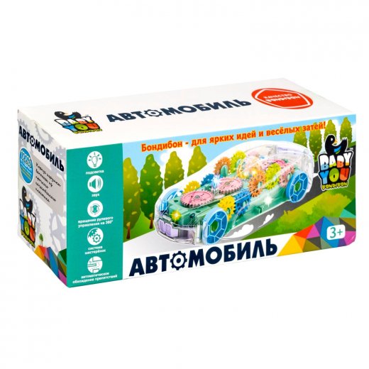 Разноцветные шестерёнки весело крутятся в прозрачном корпусе автомобиля! Прозрачный корпус позволяет ребёнку наблюдать, как работает механизм, как стыкуются между собой и вращаются яркие детали игрушки. Музыкальный АВТОМОБИЛЬ С ШЕСТЕРЁНКАМИ от Bondibon способствует развитию интеллектуальных способностей малыша, развивает его любознательность, помогает мелкой моторике, тренирует слуховое и зрительное восприятие. Звуковые и световые эффекты приведут малышей в восторг. Игрушка светится разноцветными огоньками и создает праздничное настроение. Веселые мелодии очень нравятся детям. К тому же машинка не просто едет, она может автоматически обходить препятствия. Ее рулевое управление вращается на 360 градусов. Ударопрочный корпус игрушки непременно порадует родителей. Даже если ребенок встанет на машинку полностью, она не повредится.