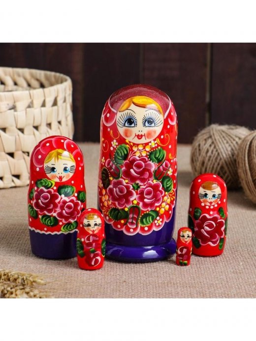 Комплект включает в себя 5 игрушек разных размеров, обязательно объединенных общей идеей росписи и цветовой гаммой. Самая маленькая матрёшка не раскрывается.