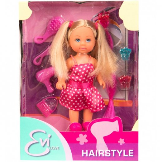 - Длинные светлые локоны Еви можно украсить яркой прядью и заколочками, а расческа и фен позволят малышкам представить себя парикмахером.