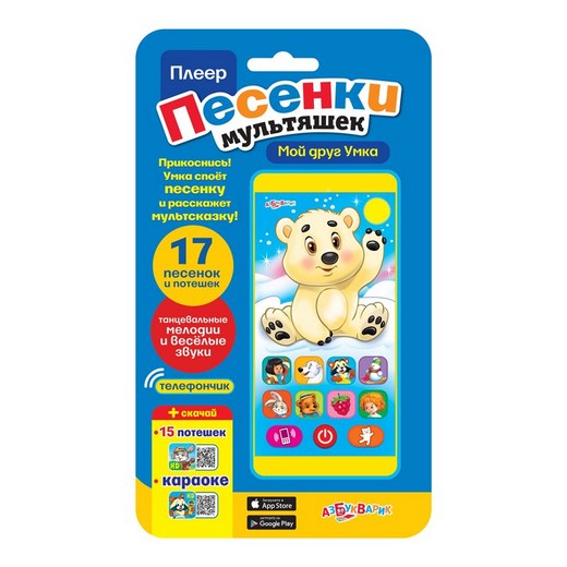 Плеер песенки мультяшек "Мой друг Умка"- это яркая и интересная игрушка, которая порадует вашего малыша и подарит ему множество позитивных эмоций. Плеер "Мой друг Умка" - отличная альтернатива современным мобильным устройствам, предназначенная специально для детей. Портреты персонажей нанесены на кнопки, поэтому выбирать соответствующую мелодию можно одним нажатием. На экране плеера кроха обнаружит очаровательного медвежонка Умка, который при касании его пальчиком начинает рассказывать сказку и поет песенку.