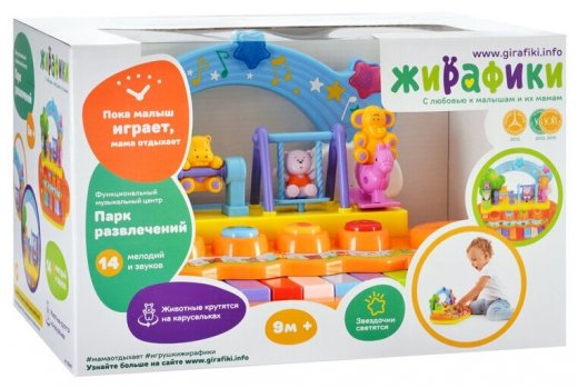 Музыкальный игровой центр Жирафики «Парк развлечений» поможет ребенку не просто весело и интересно провести время, но и потренировать звуковое восприятие, а также мелкую моторику рук. Игровой центр представляет собой специальное пианино для детей, которое может звучать как один из музыкальных инструментов, выбираемых отдельными кнопочками. Игровой центр может как издавать звуки, создаваемые ребенком при помощи клавиш, так и воспроизводить одну из 14 готовых мелодий. Режим проигрывания мелодий включается специальной кнопкой с изображением нот. Во время звучания мелодий радуга освещается огоньками, а парк развлечений, расположенный в верхней части игрового центра, словно оживает: медвежонок качается на качелях, а бегемот начинает поворачиваться на перекладине.