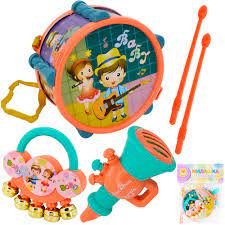 Комплектация: игрушечные музыкальные инструменты – 5 шт (барабан, дудка, барабанные палочки 2 шт, гармошка)