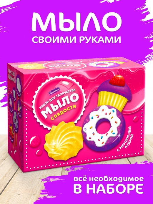 С помощью этого набора вы самостоятельно сделаете мыло в форме сладостей. Это интересное и познавательное занятие. Мыло, сделанное своими руками, станет отличным подарком для близких!