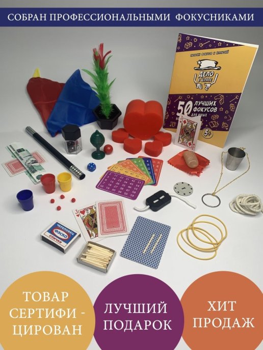 Реквизит для 50 зрелищных трюков, таких как: - 3 стаканчика, 3 шарика - прохождение карты сквозь купюру, цепочки сквозь кольцо - спичка летает над картой - несколько трюков с волшебной палочкой - изменение цвета платков - размножение поролоновых сердечек - телепортация шарика - исчезновение платка/стакана/соли - несколько фокусов с веревкой, фишкой, игральной костью - угадывание загаданного числа - ментальные трюки и другое.