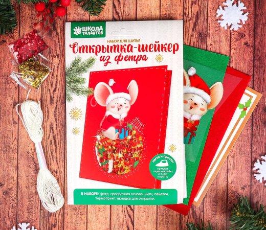 Состав набора: прозрачная основа, фетр, нити, пайетки, термопринт, вкладка для открытки.
