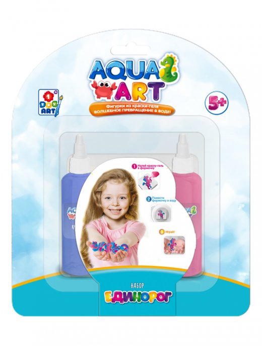 Наборы "AQUA ART" - это оригинальные наборы для создания фигурок из цветного геля. Нужно только заполнить гелем формочки, опустить их в водный раствор и игрушка готова! В каждый комплект входит формочка, два тюбика с краской-гелем, палочка и инструкция. Блистерная упаковка является ёмкостью для водного раствора. Набор развивает творческое мышление, воображение и мелкую моторику.