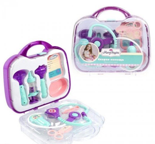 Медицинский набор «Скорая помощь» в чемоданчике от ТМ Mary Poppins. В комплект входят следующие игрушки: фонендоскоп, шприц, безопасные ножницы, лоток для инструментов, карта пациента, отоскоп, молоточек, пинцет и градусник.