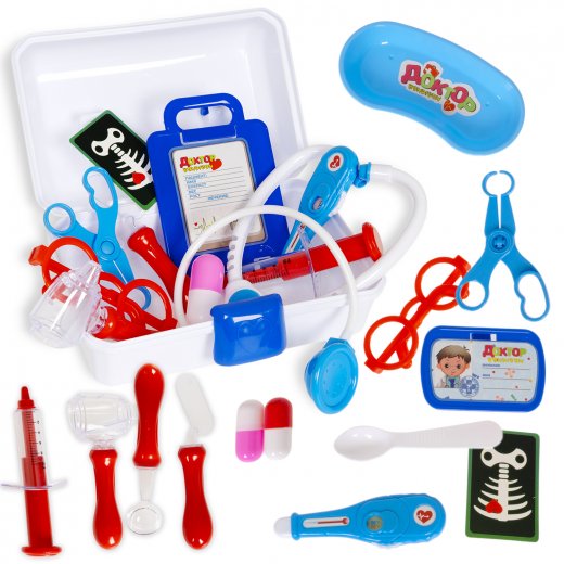 В комплекте 17 предметов: чемоданчик, рентгеновский снимок, планшет для записи анамнеза, бейдж, лоток, капельница, фонендоскоп, капсулы (2 шт.), отоскоп, шприц, зеркало медицинское, ложечка, градусник, витамины, ножницы и очки.