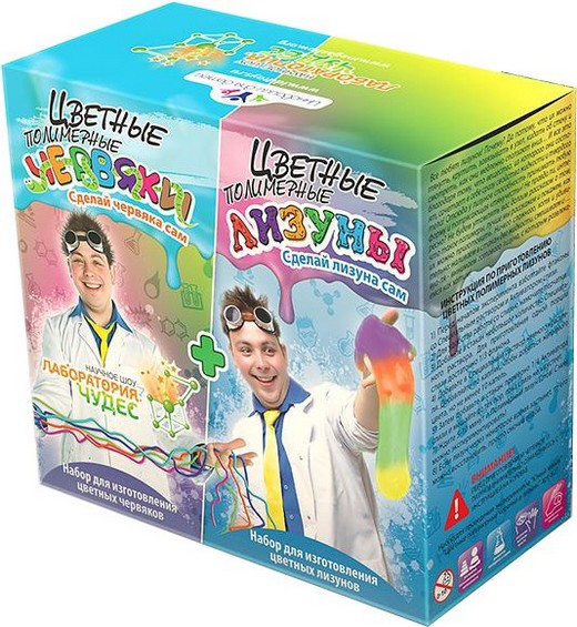 Цветные полимеры "Червяки и Лизуны" - это сразу два интересных и красочных эксперимента в одном. Ребенку нужно будет смешать реагенты и вещества в колбах, чтобы получить забавные полимерные игрушки - ярких и пластичных "лизунов" и "червяков". В наборе имеется красочная инструкция по опытам с необходимыми пояснениями, и весь процесс рассчитан таким образом, чтобы быть безопасным для ребенка. С получившимися червячками и лизунчиками потом можно будет играть и забавляться. Готовые лизуны можно растягивать, крутить, кидать в стену и смотреть, как они медленно отклеиваются. Лизуны меняют форму и обладают фантастической тягучестью благодаря свойствам вещества, из которого они состоят.