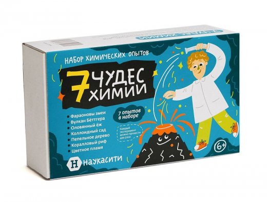 Семь чудес уместились в одной коробке, а покажет их удивительная наука — химия. Ребёнок сделает огненную радугу, вырастит дерево из пепла, а ёжика – из олова. Устроит извержение вулкана, научится создавать кораллы и разобьет химический сад у себя дома. В наборе «7 чудес химии» вы найдете необходимые реактивы и посуду для проведения любимых детских опытов. Каждый эксперимент можно провести два раза.