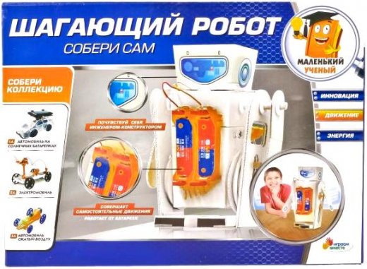 Робот способен шагать. Его приводит в движение маленький моторчик. Юный инженер будет снова и снова наблюдать за действиями игрушки собственного производства. Собирая робота, школьник поймет, что можно с пользой использовать, казалось бы, на первый взгляд, совершенно ненужные вещи. Юный техник сможет познакомится с основными понятиями физики и электроники, а также потренирует свои конструкторские способности. Ребенок узнает о том, как устроены простые электронные цепи и опытным путем увидит их действие на деле.