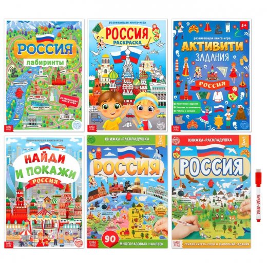 Набор представлен шестью книгами про Россию с разными заданиями, а именно:
