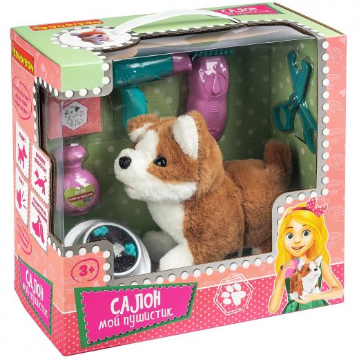 В игровом наборе "Салон "Мой пушистик" есть всё, что необходимо для ухода за четвероногим любимцем. В комплекте коробка "Корм для собак", духи "Мой пушистик", фен, тример для груминга, миска для корма и конечно же, сам пушистик - бело-коричневый хаски, который умеет ходить, вилять хвостом, лаять и реагировать на поглаживания! С этим набором не соскучится не один ребенок! Собака (размер 17 см) работает от батареек (батарейки в набор не входят).