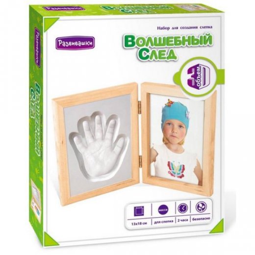 Набор для создания слепка "Волшебный след" - это замечательный набор, с помощью которого вы сможете запечатлеть отпечаток ручки или ножки малыша и навсегда сохранить воспоминания о том времени, когда ваш ребенок был маленьким. Для этого ему нужно только, следуя инструкции, смешать гипс со специальной массой и воспользоваться формой для отливки. Готовый барельеф в деревянной рамочке, которая также входит в комплект, можно будет поставить на полку, украсив интерьер детской комнаты.