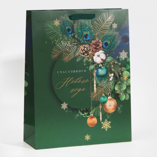 Пакет подарочный Счастливого Нового года Венок из шаров и перьев 31 х40 х11.5 см