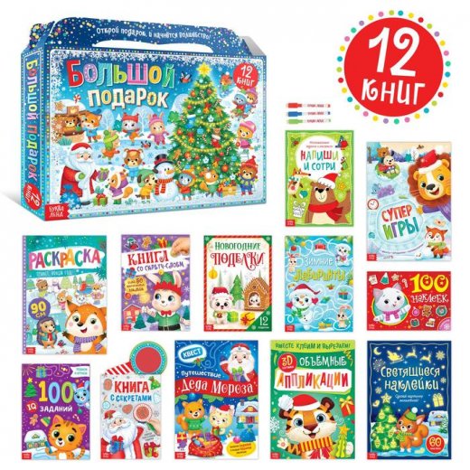 Набор новогодних книг — прекрасный подарок для каждого ребёнка. В нём есть книги с заданиями, раскраски и издания со светящимися наклейками, которые так любят дети.