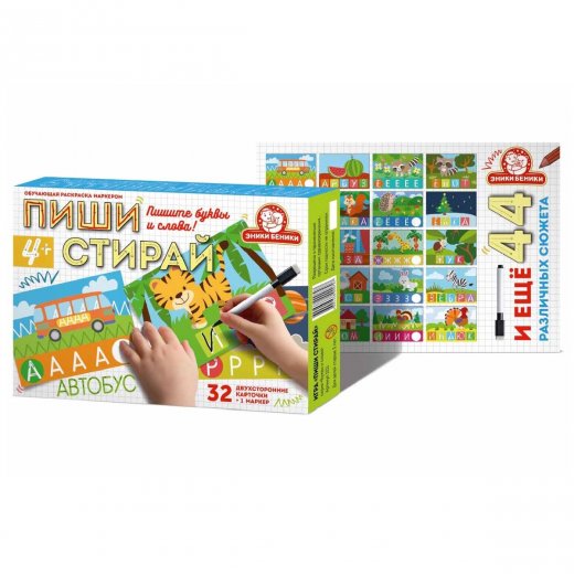 Настольная игра "Пиши стирай" научит детей писать буквы и слова, подготовит мальчиков и девочек дошкольного возраста перед школой или поможет натренироваться младшеклассникам в письме. Внутри коробки 32 яркие двусторонние карточки и черный маркер. С помощью него с одной стороны нужно будет обвести по контуру определенную букву, а с другой уже целое слово. Этот процесс можно проделывать бессчетное число раз, так как чернила маркера стираются.