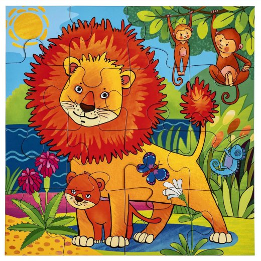 Пазл с изображением льва состоит из 16 элементов.Материал идеально подходит для детских ручек. Большие детали выполнены из плотного толстого картона. Благодаря этому они ровно лежат, замки легко соединяются и хорошо держатся. По тактильным ощущениям малыш сразу понимает, правильно ли он собрал пазл.