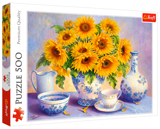 Пазлы Подсолнухи от польского бренда Trefl состоят из 500 фигурных элементов для сборки фотокартины с изображением натюрморта с подсолнухами.
