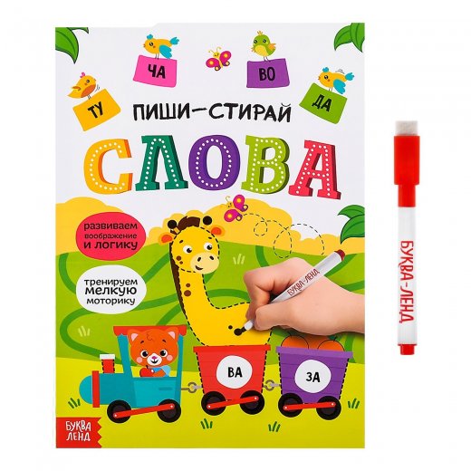 "Пиши-стирай. Слова" – это особенная многоразовая тетрадь. На её специальных страничках можно писать и рисовать, а потом стирать и выполнять задания снова, обводить линии, дорисовывать детали, фантазировать и отгадывать ребусы. Специальное покрытие на страничках позволяет легко стирать фломастер и тренироваться много раз.