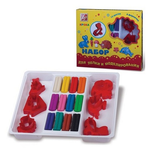 Состав набора: пластилин 12 цветов, формочки 6 шт, стек. Рекомендуемый возраст: от 3-х лет.