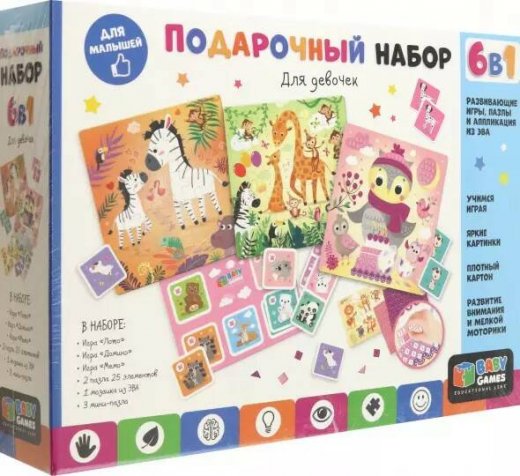 Подарочный набор 6 в 1 для девочек - это уникальный набор, включающий в себя интересные красочные пазлы с милыми зверятами, будто сошедшими в детских открыток, а также целый ряд развивающих и обучающих настольных игр, благодаря которым ребенок узнает, что такое лото и домино, а также потренирует память.