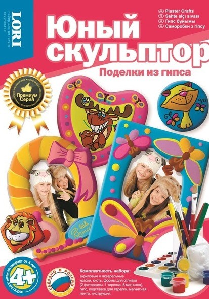 Изготовлению гипсовых скульптур неимоверное количество лет. И снова оно на волне. Компания Lori предоставляет малышам уникальную возможность поработать с природным материалом. Гипс быстро затвердевает, слегка увеличиваясь в объеме, и легок в процессе творчества. Ребенок, взяв барельеф, акриловые и акварельные краски из набора, создаст поделки. Дизайнерская тарелка на подставке, пара фоторамок, 8 магнитов – вот результат кропотливой работы скульптурного модельера.