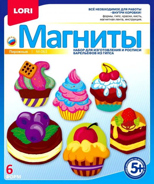 С помощью набора для создания и росписи барельефа "Пирожные" от производителя LORI ребенок сможет своими руками смастерить чудесные яркие магниты, которые станут замечательным аксессуаром на холодильник или приятным сувениром. Детям предстоит самостоятельно создать фигурки сладостей из гипса. Для этого в комплекте имеется и материал, и формочки. После застывания барельефа их следует раскрасить. В наборе также представлены кисти и краски, а также специальная магнитная лента, которую следует прикрепить к основанию фигурных изображений аппетитных кексиков.