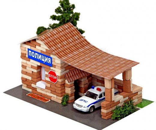 Состав набора: кирпичики, крыша, картонные комплектующие (подоконники, окна, двери, декоративные элементы), площадка под строение с имитацией ландшафта, клей ПВА-М, инструкция.