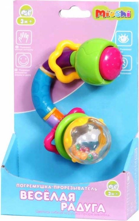 Погремушка-прорезыватель "Веселая радуга" поможет развить мелкую моторику, восприятие формы и цвета предметов, а также слух и зрение, а также помогает снять боль при прорезывании зубов у вашего малыша.Рекомендуемый возраст: 3 мес.