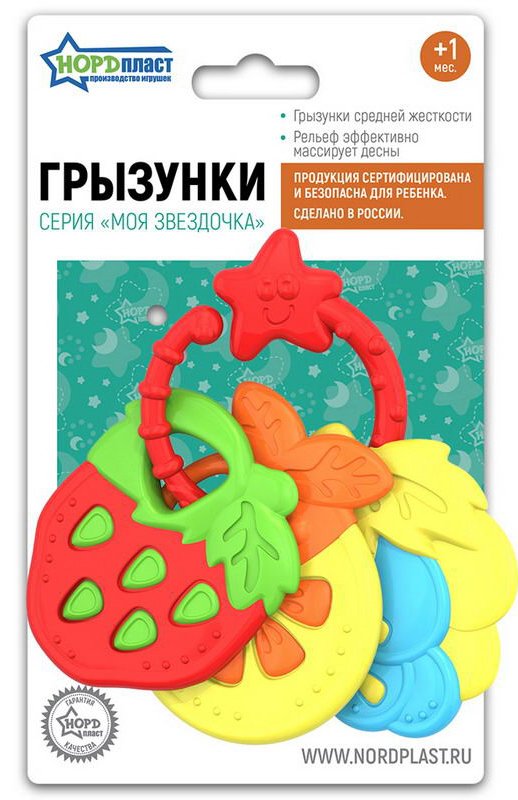 Грызунки "Фрукты 3 шт." предназначены для самых маленьких деток. Каждая мама знает, что, когда у малыша начинают прорезываться зубки, он тянет в рот все, что может помочь унять зуд и неприятные ощущения. В помощь родителям и крохам предлагаем грызунки фрукты. В каждом наборе три разноцветных грызунка, соединенные колечком. Грызунки удобно держать за колечко, при желании каждый грызунок отсоединяется. Грызунки Нордпласт можно использовать для деток от 1 месяца. Особенно важно, что при производстве используются специальные пищевые красители абсолютно безопасные для ребенка, а отличительной чертой данного набора является комбинация двух материалов, одна сторона помягче для только начинающихся резаться зубиков, а другая более жесткая.