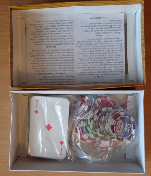 Игра Покер подойдет для начинающих игроков. Он экономичный и довольно простой. Такую коробку можно взять с собой куда угодно, просто положив в машину. Захватите его на дачу, в паб, на выезд, в путь и он обеспечит Вам захватывающее и азартное времяпрепровождение! Более того, карты и фишки лежат в отдельных пакетиках и вытащив их из коробки вы запросто сможете поместить их в карман. Тогда уж точно проблем с транспортировкой не будет!