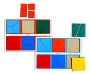 Складывая квадраты из разноцветных кусочков различной формы, ребенок выполняет несколько видов работ, неодинаковых по содержанию и степени сложности, знакомится с сенсорными эталонами цвета и формы, соотношением целого и части, основами алгоритмизации. Самые младшие начинают понимать, что из частей, иногда даже очень странной формы, можно сложить квадрат. Все детали необходимо перевернуть на лицевую сторону и сообразить, как из кусочков одного цвета сложить квадрат.
