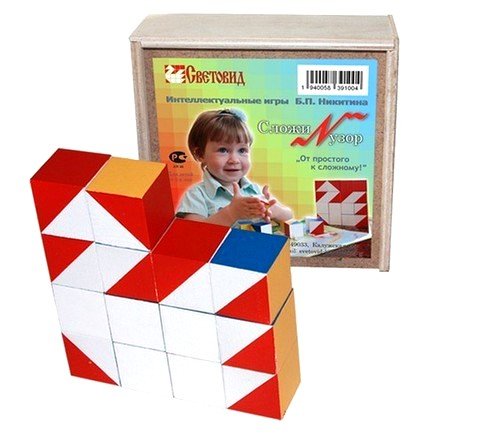 Игра Никитина «Сложи узор» понравится, как самым маленьким, так и детям младшего школьного возраста. В набор входит 16 деревянных кубиков, грани которых окрашены в четыре цвета (красный, желтый, белый, синий), а также их сочетания: красно-белый и желто-синий и методическое пособие с примерами узоров (около 70 узоров), в том числе со схемами для сборки цифр и букв (русских и латинских). Узоры напоминают контуры различных предметов и животных.