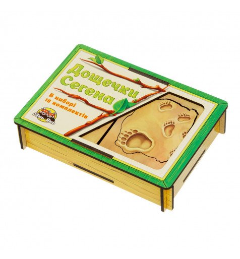 Досочки Сегена: следы зверей. Игра состоит из 18 досочек с картинками 6 зверей (кот, лиса, баран, заяц, лошадь и медведь) фото реальных животных, иллюстрации и досочки со следами этих зверей. Предложите малышу найти каждому животному свой "домик-рамочку". Обратите внимание ребёнка на то, что каждый вкладыш должен совпасть с нужным "домиком" не только по форме, но и по рисунку. Занятия с досочками Сегена позволят сформировать у ребенка представления о формах и цветах, повысить устойчивость внимания и приобрести первые понятия о категориях "часть-целое".