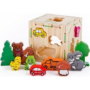 Сортер "Веселые фигурки 13 деталей" выполнен в виде куба из натурального дерева, на его гранях расположены отверстия соответствующие по форме фигуркам в комплекте. Фигурки оформлены очень красочно в виде представителей животного и растительного мира, а также игрушек, знакомых ребёнку. Задача ребёнка поместить фигурки внутрь куба через отверстия подходящие им по форме.