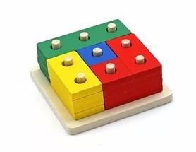 "Головоломка деревянная" достаточно сложная, но оттого и интересная головоломка! На деревянном планшете находятся девять деревянных "гвоздиков", расположенных на одинаковом расстоянии друг от друга. На них надеваются разноцветные деревянные фигуры в форме уголков и прямоугольников с отверстиями для "гвоздиков", они располагаются в 4 ряда: уголок с тремя отверстиями, уголок в форме "Г" с четырьмя отверстиями, прямоугольники с двумя и тремя отверстиями. Нужно нанизать все фигуры на "гвоздики" определенным образом, чтобы в кадом ряду они лежали в форме квадрата (один ряд собрали в форме квадрта, затем второй ряд- в форме квадрата и т.д.).