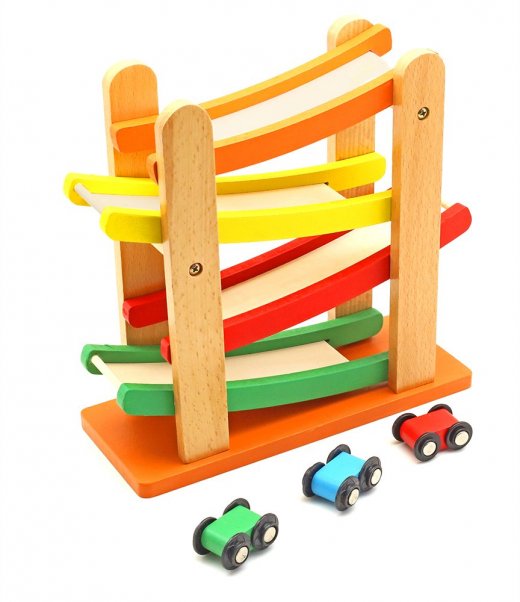 Суть игры заключается в следующем: машинка (в комплекте их 3), ставится на самую верхнюю перекладину, и далее остается наблюдать как машинки катятся по разноцветным спускам, падая через отверстие в конце желобка на нижний этаж, и так до самого парковочного места (выемка на нижней перекладине основания). И машинки, и сама горка изготовлены из дерева, хорошо обработаны и окрашены в сочные яркие цвета.