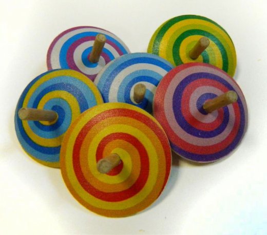 Второй: на столе расставляют любые имеющиеся предметы: шарики, чурочки, кубики и т.д. Волчки запускают по очереди. Чей волчок собьет наибольшее число предметов, тот и выигрывает.