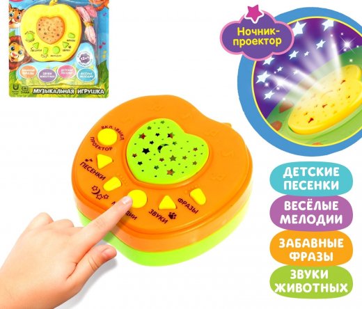 Музыкальная игрушка «Весёлые зверята» поможет ребёнку быстрее заснуть и развлечёт, если он заскучает. Устройство воспроизводит популярные колыбельные и другие песенки и мелодии, звуки животных и забавные фразы. Проектор передаёт качественное изображение картинок, а мягкий приглушённый свет ночника подарит сладкий сон вашему малышу.
