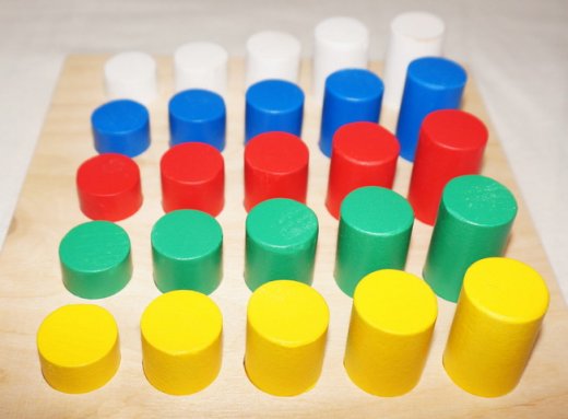 Сортировщик "Цвет и высота" представляет собой основу – планшет из 10 мм фанеры, ее размер 17,5х16,5 см. К основе в комплекте идет набор элементов в виде колышков, 5 размеров и 5 цветов (красный, белый, синий, зеленый, желтый). Общее количество колышков – 25 штук. Высота большого колышка – 4,5 см, а маленького – 2,5 см, в диаметре все детали 2 см.