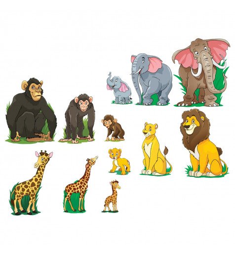 Вкладыши больше меньше "Семья Африка" – трехслойные вкладыши - 12 фигурок диких животных (по 3 штуки каждого вида: папа - мама - малыш) разного размера, которые необходимо вкладывать на своё место по форме и размеру. С помощью таких вкладышей можно легко объяснить ребёнку понятие "большой" и "маленький", поиграть в игру "Где чей малыш, мама или папа?". Вкладыши легко достаются пальчиком.
