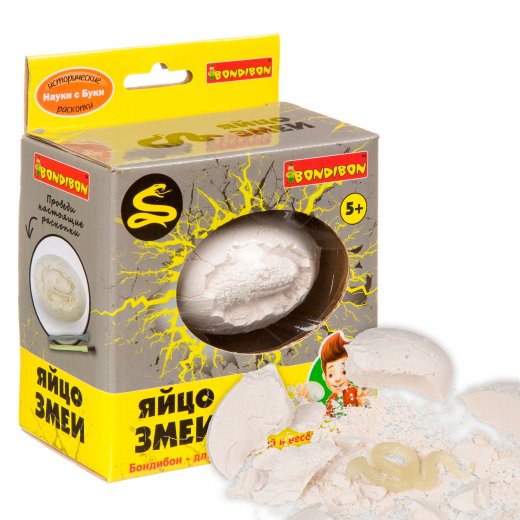 Проведи настоящие раскопки и посмотри, что находится внутри! В окаменевшем яйце - змея. Но не простая, а светящаяся! Добудь ее с помощью специальных инструментов для раскопок из набора. Инструкция по проведению раскопок находится на оборотной стороне упаковки. Bondibon - для ярких идей и веселых затей!