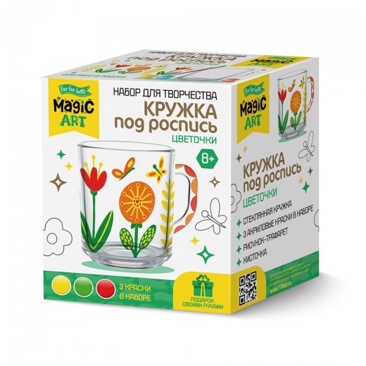 Кружка под роспись «Цветочки» обязательно увлечёт вашего ребёнка яркими цветами и оригинальным исполнением! Используя шаблон, Вы сможете сделать неповторимую композицию на стеклянной поверхности и дополнить ей ваш интерьер. Кроме того, необычно оформленная кружка может стать великолепным подарком близким и друзьям.