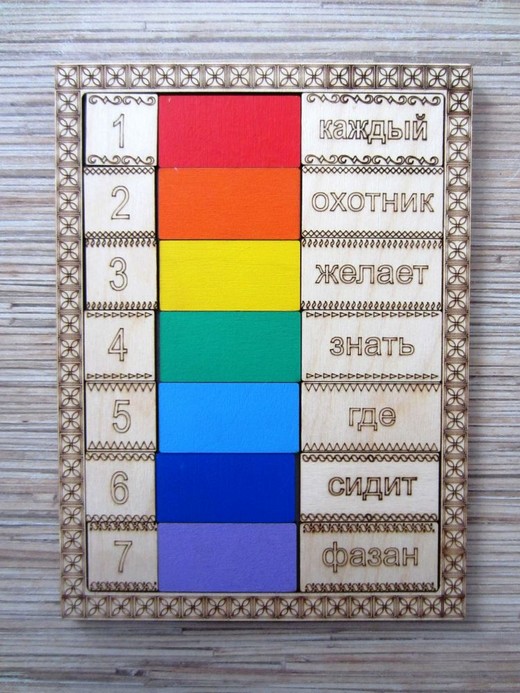 Игра основана на всем известной считалочке: "Красный охотник желает знать, где сидит фазан". В этой фразе начальная буква каждого слова соответствует начальной букве названия определённого цвета.