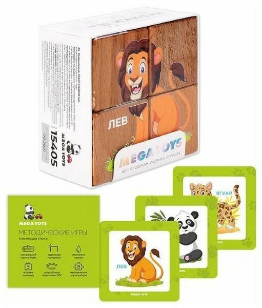 Комплектация: 4 кубика с изображением 6 животных,3 двухсторонних карточки и методическая брошюра-пособие