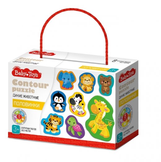 Контурные пазлы-половинки "Дикие животные" – первые пазлы для вашего малыша, каждый из которых состоит из 2 крупных деталей. С набором контурных пазлов-половинок «Дикие животные» малыш сможет собрать фигурки 8 зверей: жирафа, пингвина, тигра, медвежонка, зебру, льва, слонёнка и черепашку. Каждая фигурка состоит из 2 частей, что позволяет научить ребёнка находить половинки картинок, разбитых на части. Изображения диких животных созданы иллюстраторами с учётом возрастных особенностей малышей, именно поэтому образы персонажей – яркие, добрые и позитивные.